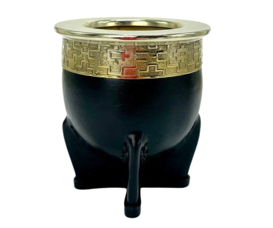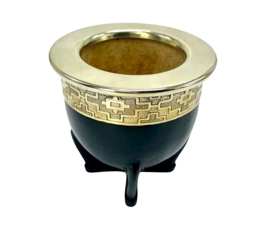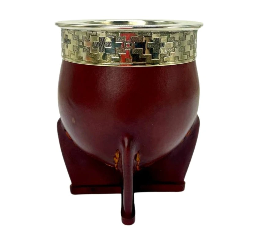 Denne luksuriøse og elegante imperial mate-kop i kalabas er håndlavet i Argentina. Koppen er beklædt med ægte læder og afsluttet med en smuk ornamenteret alpaca-krave (også kendt som new silver), som giver et eksklusivt udtryk og en autentisk, traditionel maté-oplevelse.